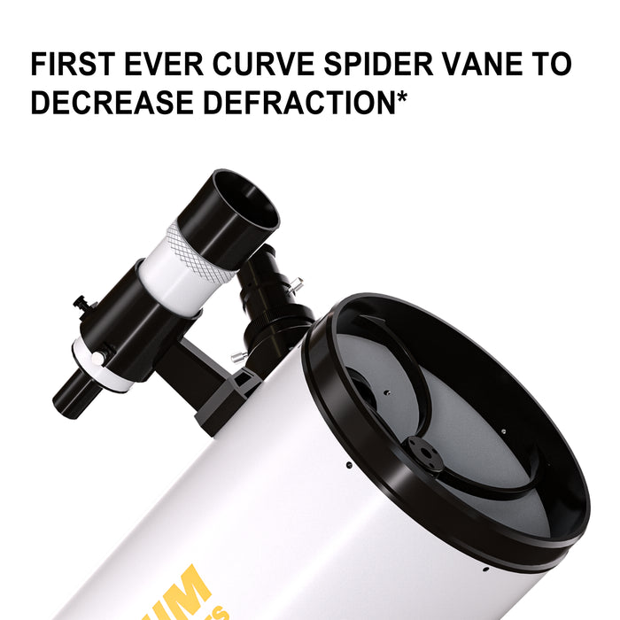 Curved spider vanes reduce diffraction spikes on bright stars and planets, improving contrast and giving images a more natural, refractor-like quality.